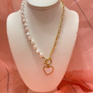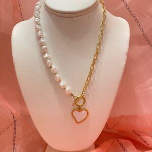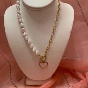 Elegant necklace featuring a gold chain and white pearls, adorned with a heart pendant. Perfect for adding a touch of sophistication to any outfit.