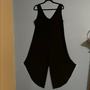 Stylish black jumpsuit with a sleek design. Ideal for versatile wear.that is easy to dress up or down. Loose comfortable fit is great when the temperature rises. Looks great belted or layered with a tank or denim jacket.