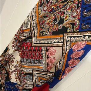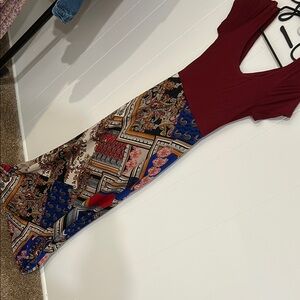 • This elegant maxi dress features a rich burgundy top paired with a vibrant multicolor patterned skirt. Perfect for any occasion, it combines style and comfort effortlessly. Purchased on Amazon, there are no tags but it is a size M and has a lot of stretch. P t P 15 inches, stretches to 19 inches, total length 53 inches.
