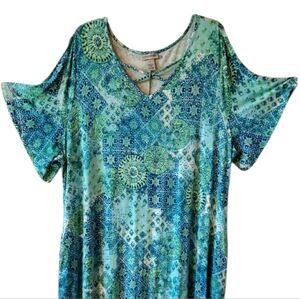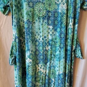 Embrace a relaxed style with this Catherines 3X Dress, featuring a vibrant blend of blue and green hues. Has short sleeves and two side pockets. Perfect for casual outings, this dress combines comfort with a chic, oceanic-inspired design. This dress will show off your curves. Fabric is soft to the touch and stretchy. Tag string is still attached, just been in drawer. If you are crafty, you can add some bling to this dress.
