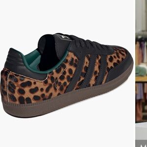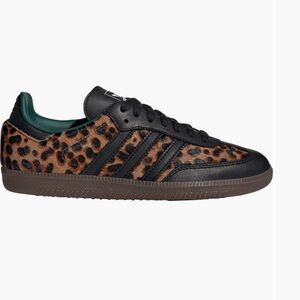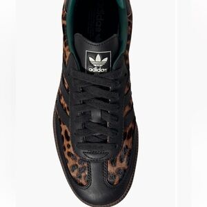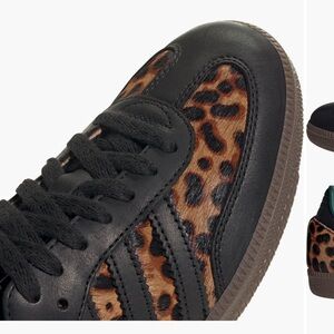 These Adidas sneakers showcase a bold leopard print in black and brown, enhanced by sleek black leather accents. The iconic three-stripe design and sturdy black rubber sole offer a blend of style and durability. Ideal for those seeking a fashionable yet classic sneaker look.