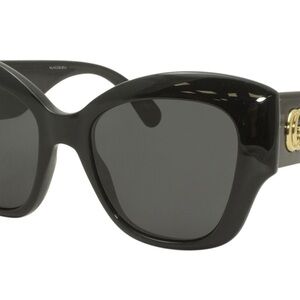 These Gucci sunglasses feature a bold, oversized cat-eye design with glossy black frames and chunky temples. The dark lenses provide a sleek contrast, while the iconic gold-tone GG logo on the temples adds a touch of luxury. Perfect for making a statement, these sunglasses embody the sophisticated style of the Gucci brand.