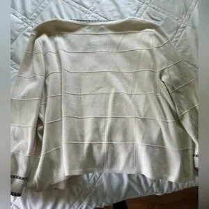Elegant women's cream cardigan featuring stylish black trim. Perfect for layering and adding a touch of sophistication to any outfit. Little stain shown in the last picture but it is not noticeable.