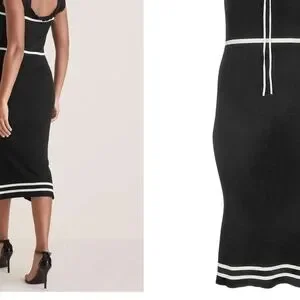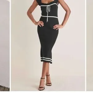 Elegant black midi dress with white trim. Sleeveless design. Perfect for any occasion.