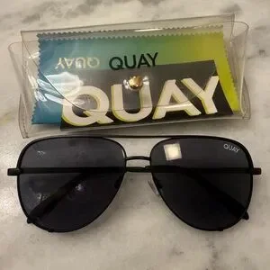 Polarized high key mini aviators by Quay Australia. Black frame and lens. Sleek design with dark lenses. Perfect for any occasion. Got them as a gift as just too big for me. Only wore them once. Lenses are in great condition with no scratches.