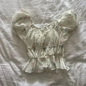 This elegant cream blouse by Doen features charming puff sleeves and a flattering smocked waist. The ruffled peplum hem adds a touch of femininity, making it a perfect choice for a stylish and sophisticated look.