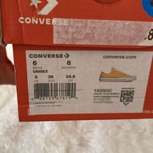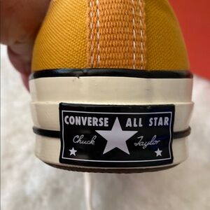 Stylish Converse sneakers. Bright yellow canvas. Classic white laces and sole. Perfect for casual wear.
