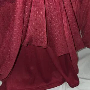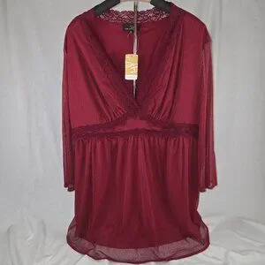 V-Neck top with lace trim and sheer 3/4 sleeves, a babydoll empire waist, and lace sheer overlay.