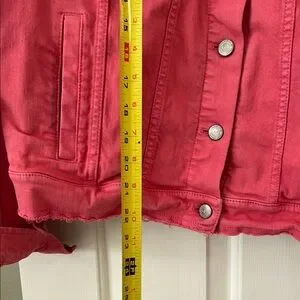 This LOFT jean jacket in a vibrant pink hue offers a fresh take on a classic style. Its cropped length and slightly washed finish make it a standout piece for casual occasions, adding a pop of color to any outfit.