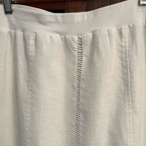 Chico's white skirt with crochet-like insets and a ruffled crepe he, The skirt if lined. Pull on style. It is Chico's size 2, or large, 12-14. It measures approx. 17" across at the waist and pprox. 35" from waist to hem at longest point. It is new with tags, retail price $109.