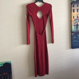 This striking red bodycon dress by Michael Costello features a daring plunge neckline and a chic cut-out detail, perfect for a cocktail night out. The ribbed texture adds a touch of sophistication, while the long sleeves and form-fitting silhouette ensure a sleek and stylish look.
