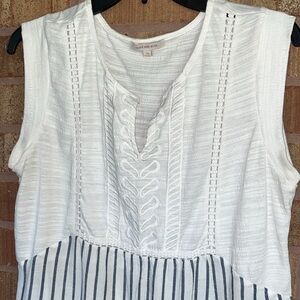 Elevate your wardrobe with this chic white and blue striped sleeveless top. Perfect for casual outings or a day at the office. Enjoy the comfort and style it brings to your ensemble.