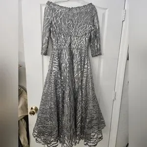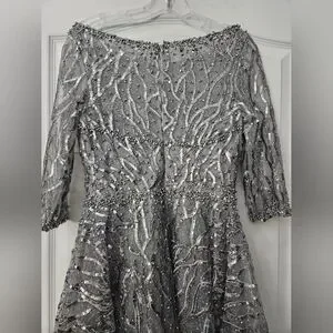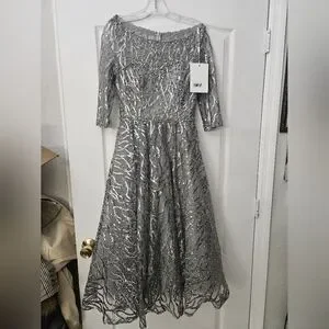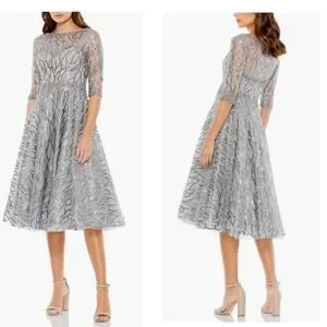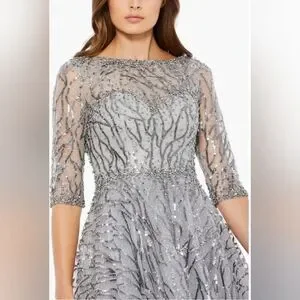 NWT Mac Duggal Silver High Neck Above Elbow Sleeve Embellished A Line Dress SZ 4