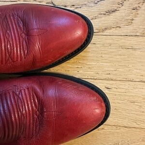 Stylish red leather western boots with intricate stitching. Perfect for a bold look.