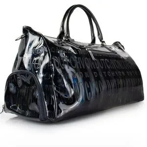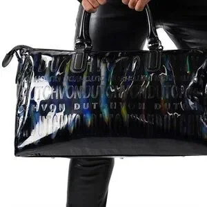 This unisex black holographic weekender bag by Von Dutch features patent black vegan leather with a reflective iridescent shine and debossed repeat logo.