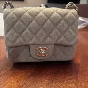 Chanel Caviar Gray Mini Classic Square Bag with Silver Chain