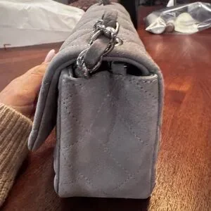 This exquisite Chanel mini bag in gray features a luxurious quilted design, complemented by a silver chain strap and the iconic CC turn-lock clasp. Its compact size and elegant texture make it a perfect accessory for any sophisticated occasion.