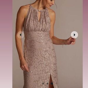 This stunning stretch lace sheath dress features a beautiful embellished keyhole detail that adds a touch of glamour to the classic silhouette. The lace fabric is both elegant and comfortable, allowing you to move freely and dance the night away at any special occasion. The form-fitting design flatters your curves, while the keyhole neckline adds a modern and sophisticated touch. Whether you're attending a wedding, prom, or any formal event, this dress is sure to make you feel like a true standout. Dress was used once, price is not firm.