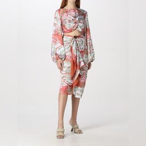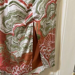 Elegant wrap skirt with floral design. Features a blend of green, white, and orange hues. Ideal for beach or casual wear.