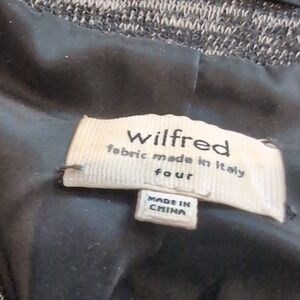 This Wilfred wool blend blazer combines a sophisticated black and gray color palette with a textured, open-front design. The cropped length and round neckline offer a modern twist on classic tailoring, making it a versatile addition to any wardrobe. Its full-length sleeves and subtle black trim add a touch of elegance to this stylish piece.