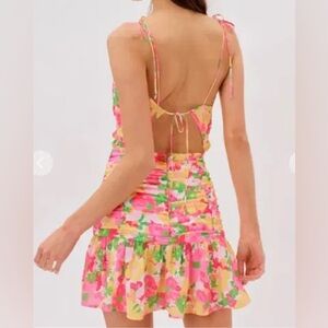 Each iteration of For Love and Lemons' signature florals is just as beautiful as the last - this 'Miranda' mini dress is patterned with blooms in vibrant neon hues. The figure-flattering silhouette features a cowl neckline and ruched skirt that ends in a playful ruffle. Wear yours with sneakers or sandals, depending on the occasion.