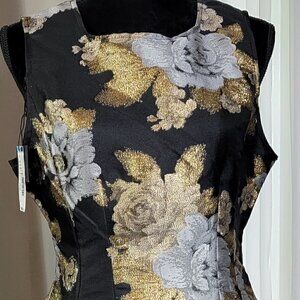 Elegant black midi dress with gold and white floral pattern. Sleeveless design. Perfect for special occasions.