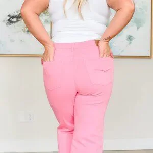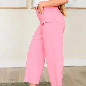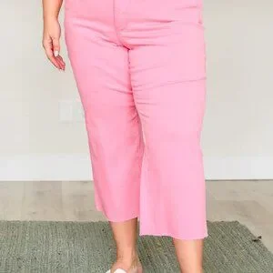 Slip into style and comfort with our Lisa High Rise Control Top Crop Jeans from Judy Blue. Featuring tummy control technology and 4-way stretch, these jeans provide a flattering fit. The wide leg crop and raw hem add trendy details, while the fun pink color will brighten up any outfit. Garment dyed for lasting color.