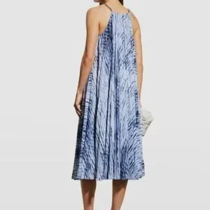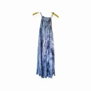 The Michael Michael Kors Midnight Blue Tie Dye Halter Georgette Pleated Maxi Dress in size M is a stylish and versatile piece perfect for various occasions such as travel, weddings, parties, and more. The sleeveless design with a halter neckline and pullover closure make it easy to wear. Made of polyester, this long dress features pleated accents and a vibrant blue tie dye color that adds a touch of bohemian flair. Ideal for the summer, fall, and spring seasons, this maxi dress is a must-have for any fashion-forward woman looking for a chic and comfortable outfit. Lined . Silver toned chain embellishments. No belt. In excellent preowned condition, like new. MSRP $325 .
