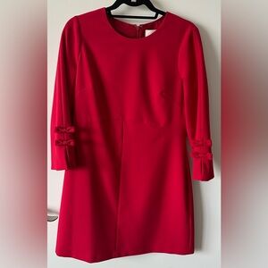 Step into timeless elegance with this vibrant red shift dress, a refined choice for both daytime events and evening affairs. Crafted in a smooth, structured fabric, this dress features a classic round neckline and a tailored silhouette that gently skims the body for a polished look. The standout detail? Delicate double bow accents at each sleeve cuff that add a feminine and playful touch. With a back zipper closure for easy wear, this dress offers both style and comfort in equal measure. Perfect for work events, luncheons, or holiday gatherings.