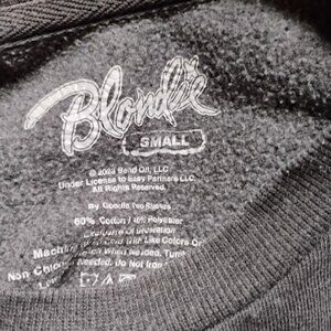 Rock out in retro style with this cozy Blondie graphic sweatshirt featuring a bold red heart and vintage script logo across the chest. The soft charcoal gray fabric is warm and comfy, while white tie-side details give it a flirty, feminine twist.