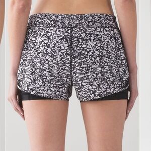 Experience ultimate comfort and style with these Lululemon shorts, featuring a unique black and white speckled pattern. Designed for athletic performance, they boast a double-layer construction with a solid black compression layer underneath.