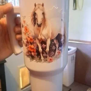 White tumbler featuring a horse and floral design. Perfect for horse lovers.