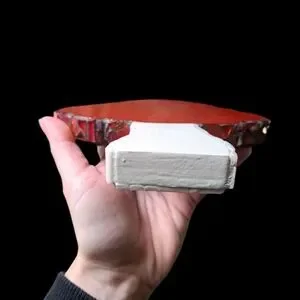 The piece is handcrafted! The back of the piece has been sealed with epoxy resin. The piece can be hung on a wall or stand alone on a table shelf, etc. Measurements are in the listing photographs.