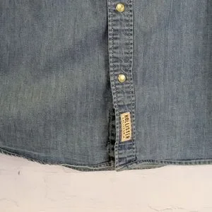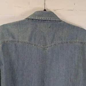 Casual light blue denim shirt. Features button-up front. Ideal for everyday style.