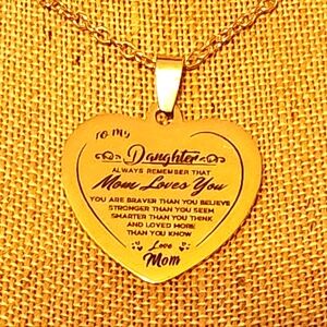 Elegant gold heart pendant necklace with a heartfelt message. Perfect for gifting to a loved one. 18" length.