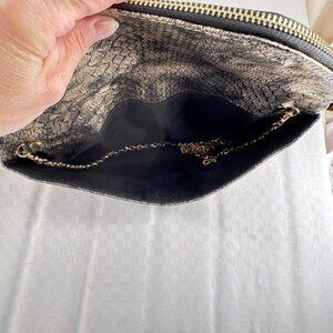 Very good used condition large clutch by Urban Expressions, a popular Stitch Fix brand. Black with metallic gold embossed snakeskin. Large zipped folding closure, dual zipper, gold tipped. One slip and one zip pocket inside. Surprisingly spacious. Optional gold chain shoulder strap. Certified vegan leather.