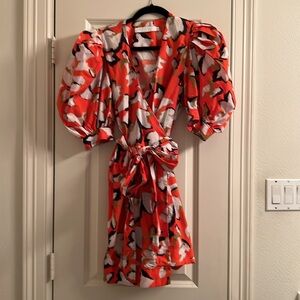 This Hunter Bell Hampton wrap dress features bold puff sleeves and a flattering silhouette. Perfect for any occasion, the orange and white pattern poppy floral adds a touch of elegance to your wardrobe. Only worn one time and ships quickly from smoke free pet free home. Original retail price $415.