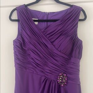 This stunning Patra dress in a deep purple hue is perfect for wedding guests and formal occasions. The sleeveless design features a ruched bodice that elegantly drapes, complemented by a scoop neckline. Its maxi length and flowing silhouette add a touch of sophistication to any event.