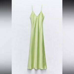 Experience the luxurious feel of this Zara chemise, crafted in a lustrous green satin. The minimalist design features delicate spaghetti straps and a sleek silhouette, perfect for a touch of elegance in your sleepwear collection.