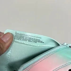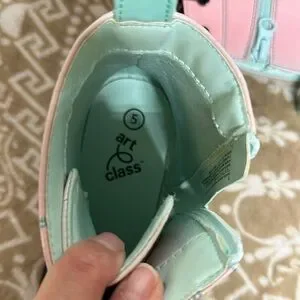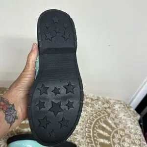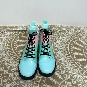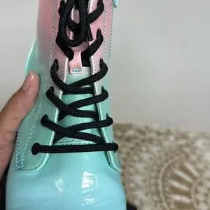 slightly scuffed and worn! Stylish combat boots with a glossy finish. Features aqua and pink panels. Black laces and soles for contrast. Perfect for a bold look.