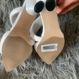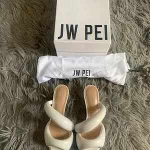 These JW PEI heels feature a sleek stiletto design with a modern, sculptural appearance. The white color and padded diagonal straps add a touch of elegance, making them perfect for formal occasions.