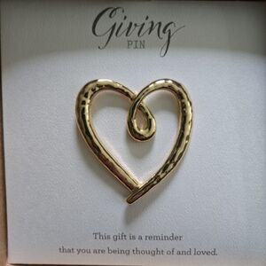 Gold colored heart-shaped pin in gift box. NWT never used. Square box is 5.5" x 5.5" pin is approx 2.5" x 2.5" (measurements in photos)