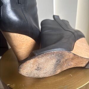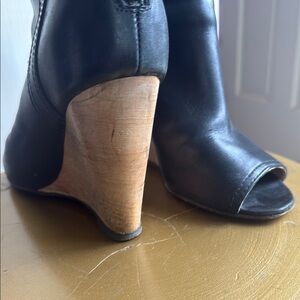 Elevate your style with these CHANEL black wedges, featuring a sleek peep-toe design and a contrasting natural-colored wedge heel. Crafted for both elegance and comfort, these shoes are perfect for any occasion.