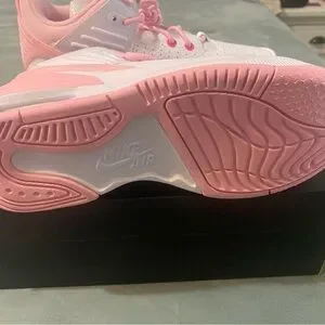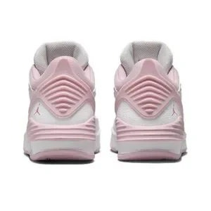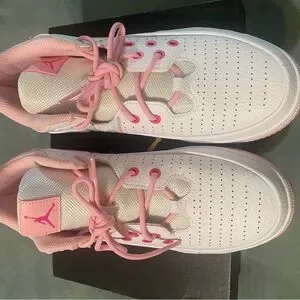 These Jordan sneakers showcase a chic blend of pink and white, featuring a predominantly white upper with perforated detailing for enhanced breathability. The pink accents, including laces and trim, add a vibrant flair, while the light pink midsole provides a subtle contrast. Perfect for athletic pursuits, these sneakers combine style and functionality effortlessly.