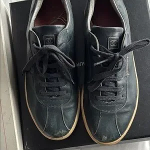 Experience timeless elegance with these CHANEL black sneakers. Featuring a sleek leather upper and a contrasting gum rubber sole, these low-top sneakers offer a minimalist design perfect for everyday wear. The classic lace-up style ensures a secure fit, making them a versatile addition to any wardrobe.