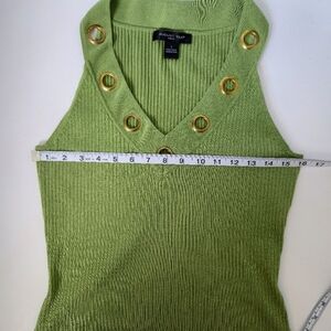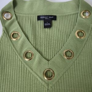 This chic tank top from August Silk features a Grinch green hue with a ribbed texture and gold embellishments along the V-neck. The sleeveless design offers a modern and stylish look, perfect for any occasion. Crafted with attention to detail, this top combines comfort and sophistication effortlessly.