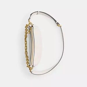 This white (Chalk) crescent-shaped bag is spacious and versatile. It is made from buttery shoft glovetanned leather finished with a secure zip-top closure detailed with C hardware. It comes with two detachable straps: a chunky chain-link shoulder strap and a cross-body leather strap, creating options to comfortably wear this bag 3 different ways.