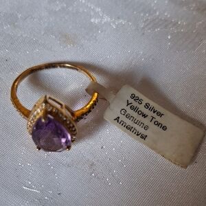 This stunning gold ring features a captivating purple teardrop gemstone, surrounded by sparkling accents. Perfect for adding a touch of elegance to any outfit.