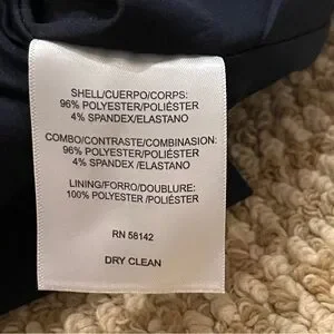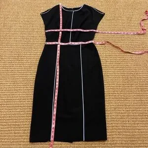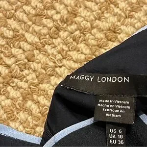 Maggy London Navy Blue Knee Length Shift Dress Contrast Piping 6 six. Piping at the chest, waistline like a belt, and at the bottom of the skirt. The skirt also has a back slit. Fully lined. Polyester spandex blend. Sleeveless dress. Neckline collar has light blue piping contrast. Worn in my role as a morning news anchor and on air tv reporter. Great for work and the office. Classy and timeless dress.