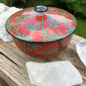 Vibrant red bowl with green bamboo pattern. Perfect for decor or serving.